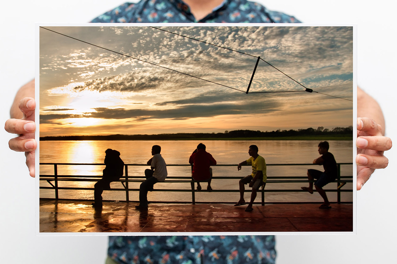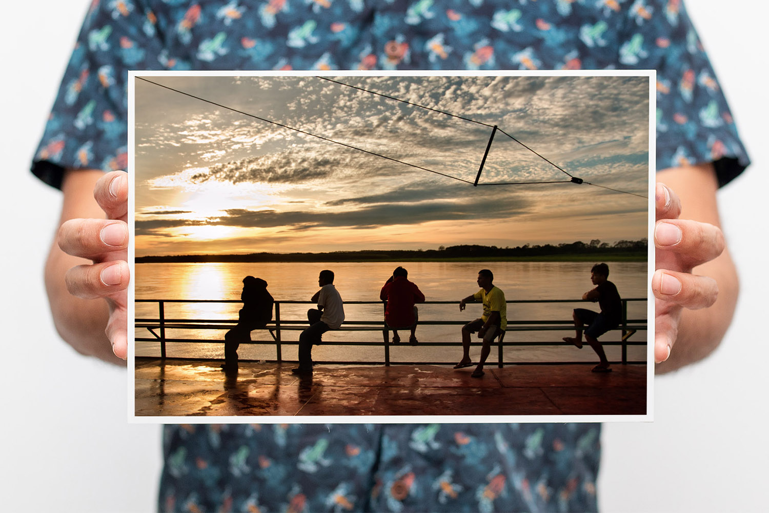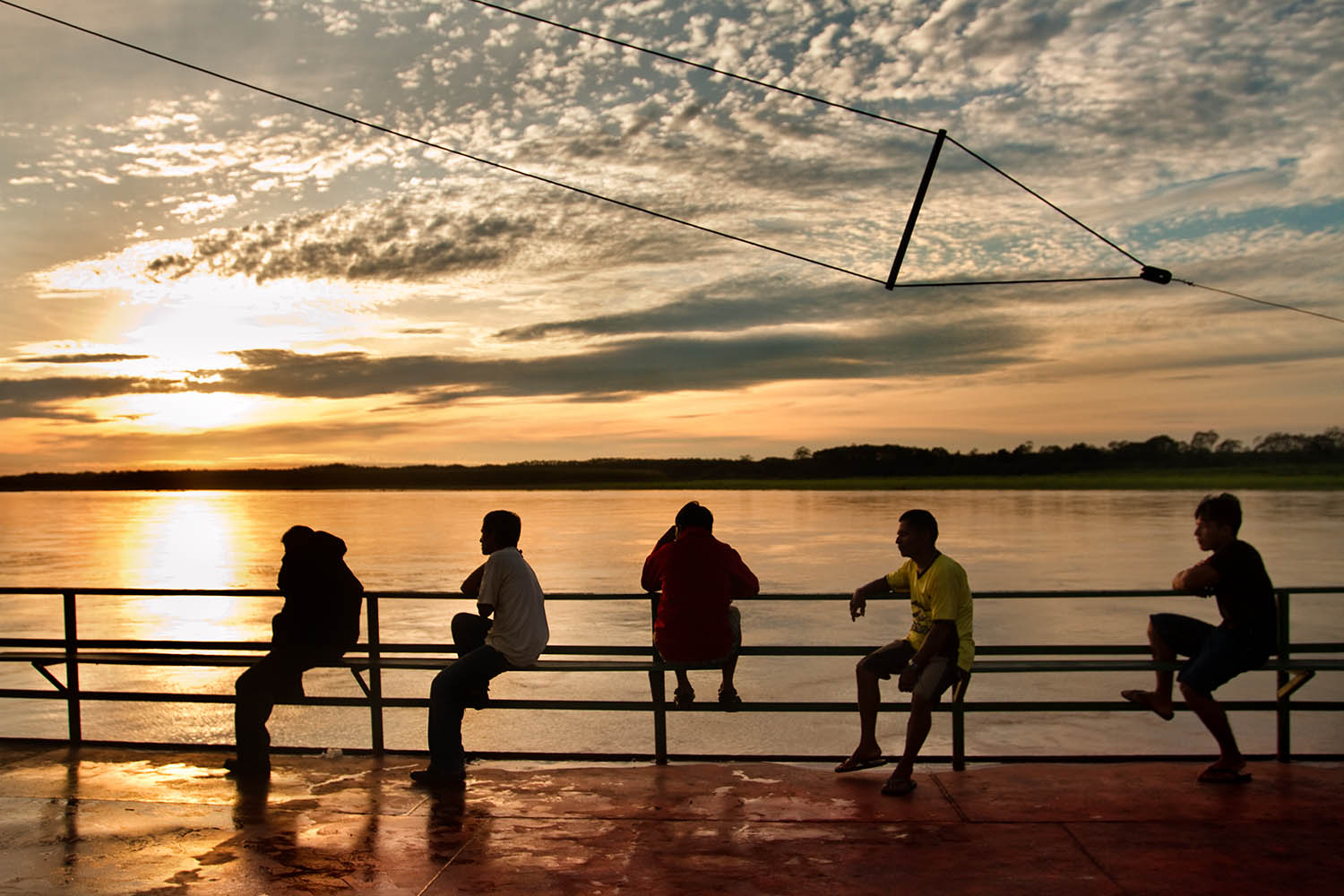 Viajantes del río Amazonas contemplan el atardecer mientras parecen convertirse en notas dibujadas sobre un pentagrama.
