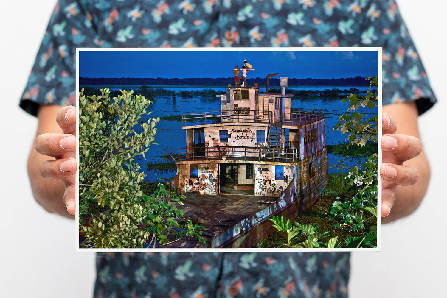 Bajo el atardecer azul eléctrico de Iquitos, tres amigos contemplan el río Itaya desde un barco abandonado.