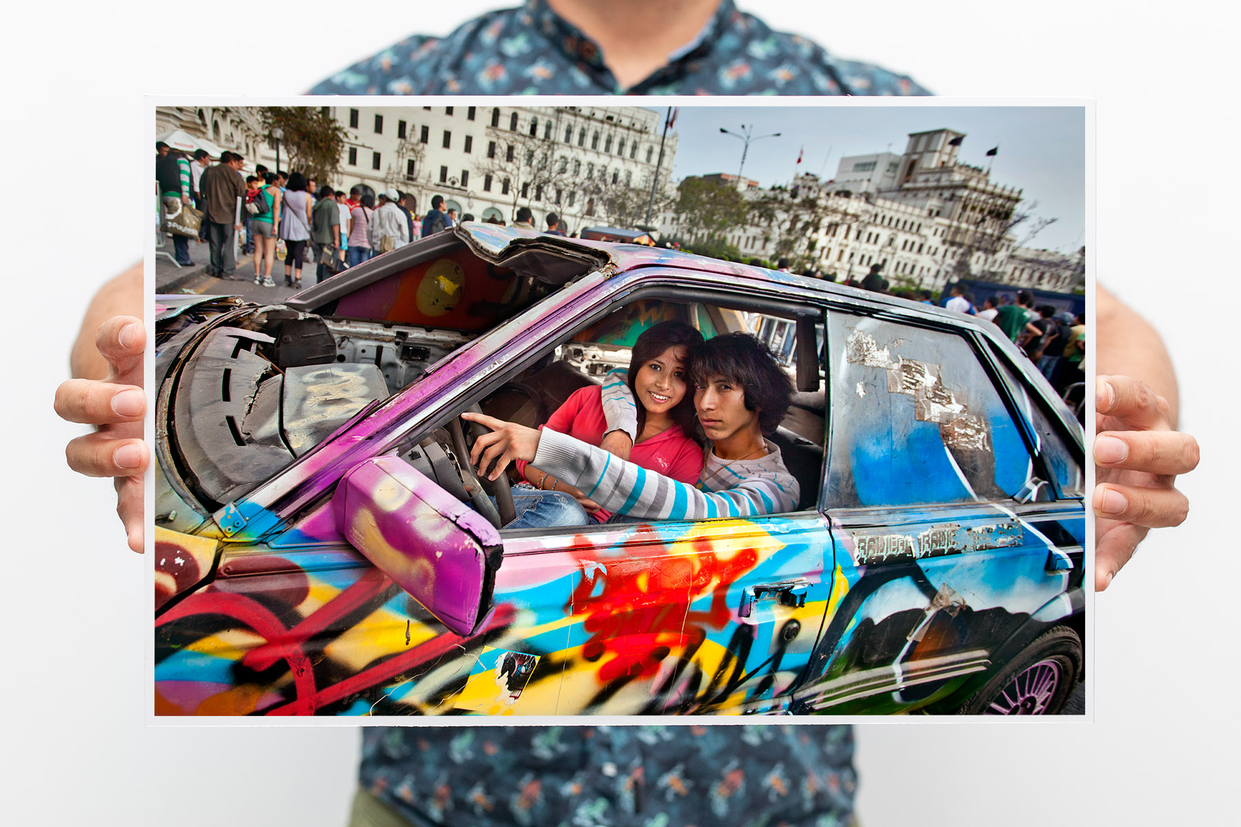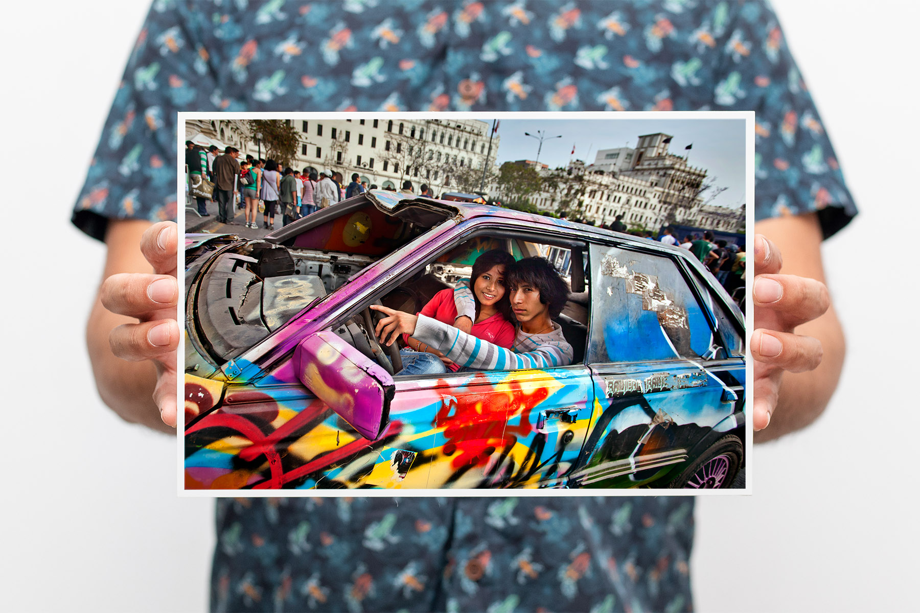 Un chico, una chica, un auto viejo y una ciudad para recorrer. Plaza San Martín, Cercado de Lima. Perú.