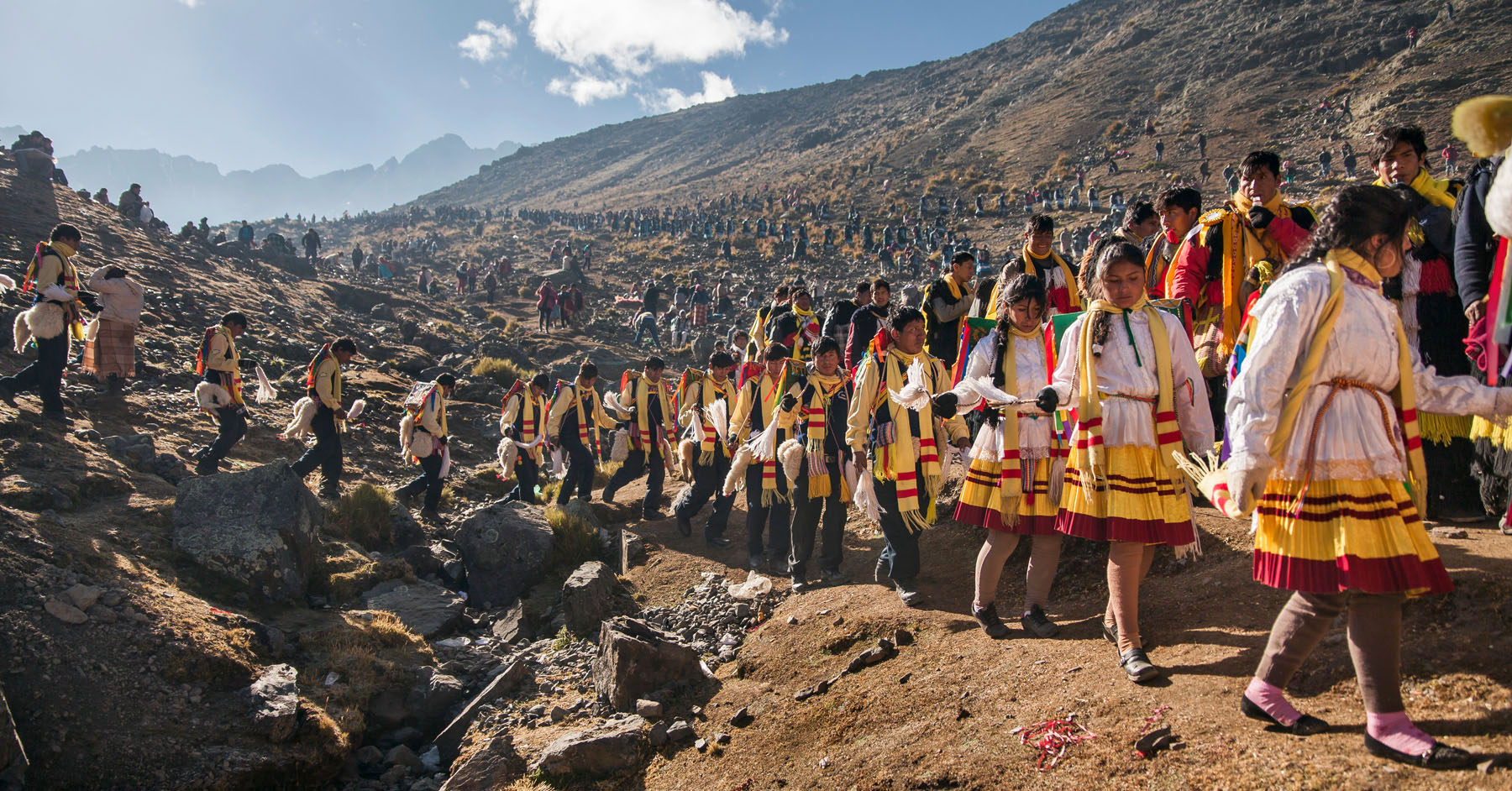 Una comparsa baila frente al nevado Sinakara durante las celebraciones para el Señor de Qoyllur riti. Cada año, miles de peregrinos acuden con devoción a una de las mayores manifestaciones de cultura e identidad andinas.