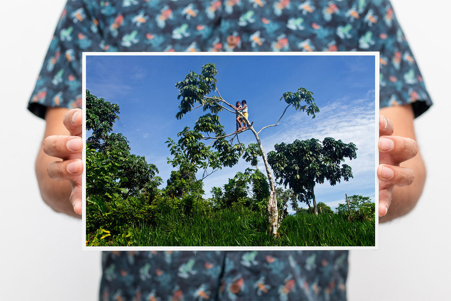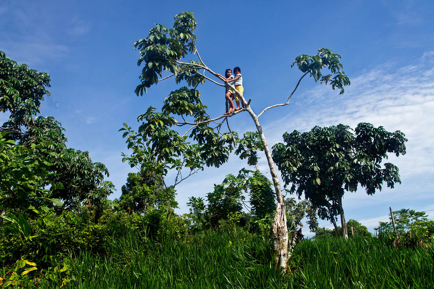 Dos niñas han subido al árbol para sacar frutos de uvilla en los bosques de Pebas.